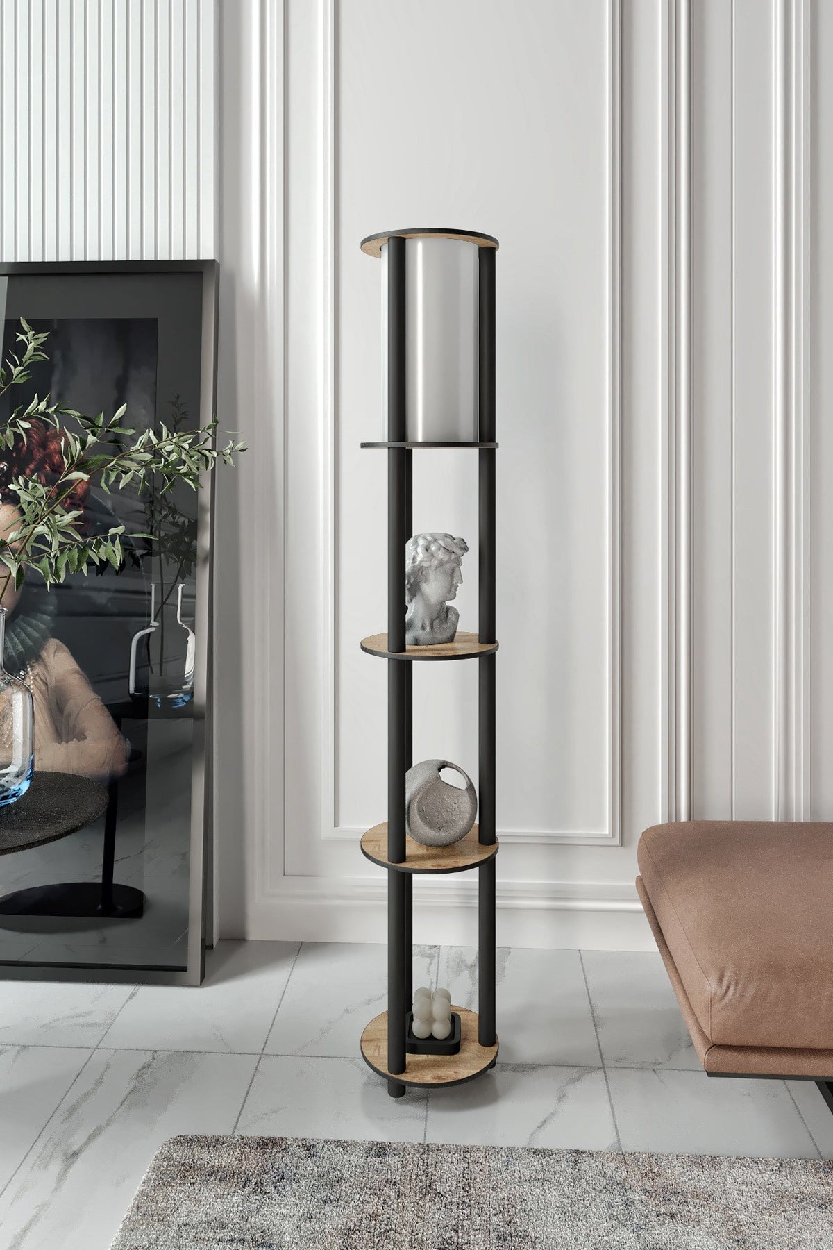 Questa piantana con ripiani portaoggetti è la soluzione ideale per chi desidera esporre piccole sculture, vasi, piante o candele, trasformando un semplice punto luce in un vero e proprio elemento espositivo di design. Il diffusore superiore a cilindro emette una luce calda e uniforme, perfetta per creare un angolo relax in salotto o per aggiungere profondità a una camera da letto moderna. Grazie al suo stile minimalista e alla combinazione di materiali caldi e industriali, questa lampada originale con mensole si inserisce armoniosamente in ambienti contemporanei o in contesti "urban chic", offrendo massima funzionalità con il minimo ingombro.