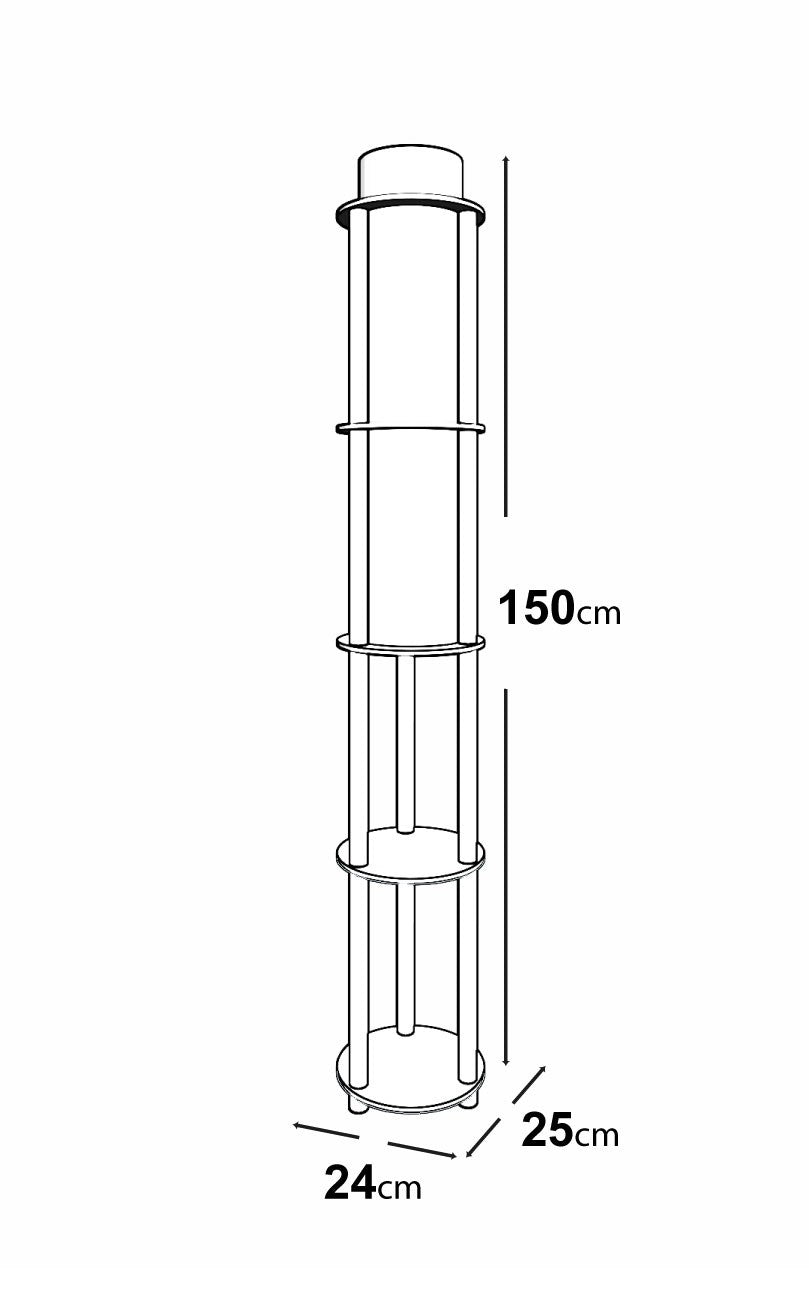 Illumina e organizza i tuoi spazi con questa esclusiva lampada da pavimento moderna, un complemento d'arredo ibrido che unisce un'illuminazione d'atmosfera a pratici piani d'appoggio verticali. La struttura, solida e slanciata, è realizzata in mdf di colore nero opaco e si sviluppa su più livelli, ospitando quattro mensole circolari in legno con finitura naturale.