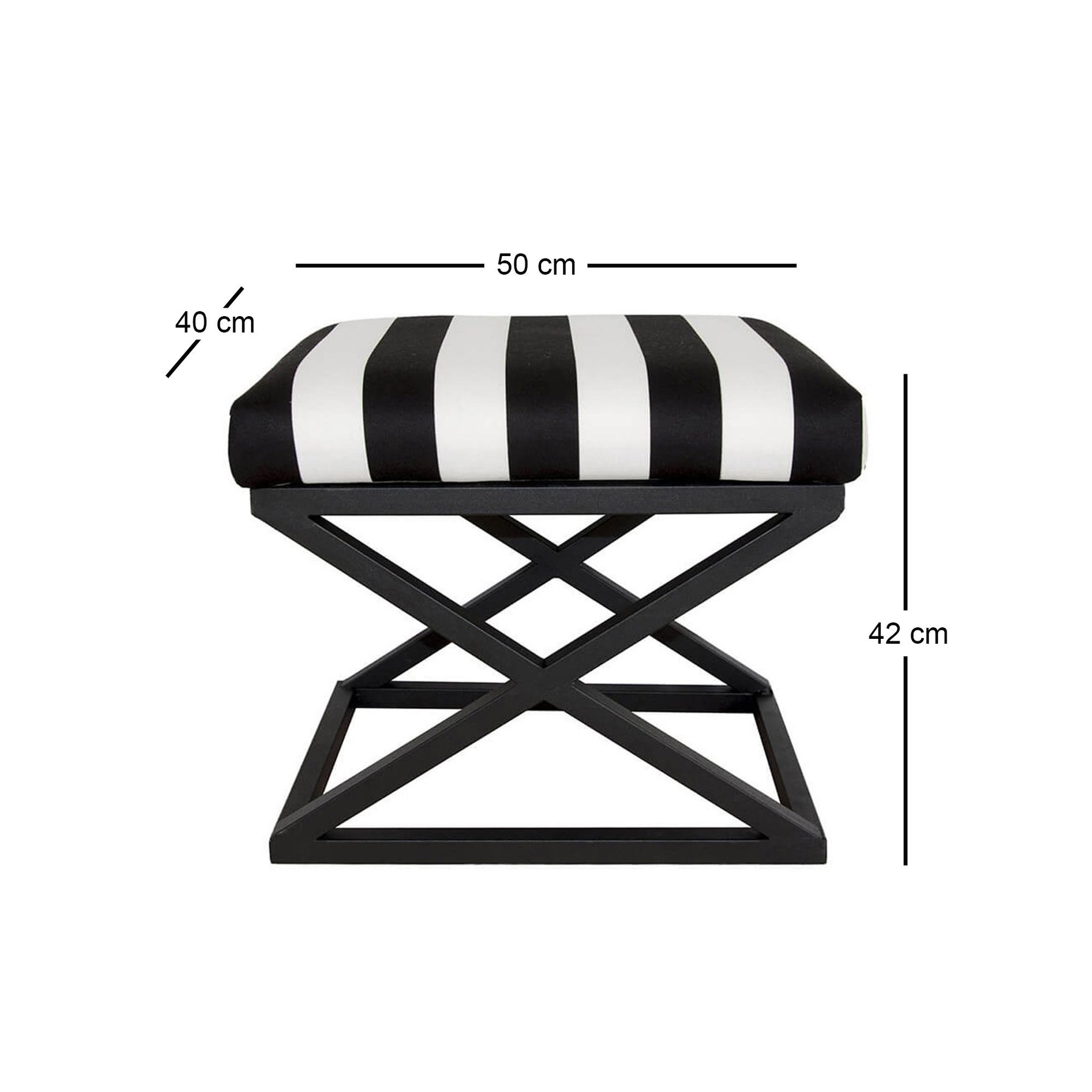 La struttura portante è realizzata in metallo nero con un originale disegno a incrocio geometrico, che garantisce stabilità e una resistenza duratura senza appesantire la linea estetica del mobile. Grazie alle sue dimensioni compatte, con una larghezza di 50 cm, una profondità di 40 cm e un'altezza di 42 cm, questo sgabello rappresenta la soluzione ideale come seduta aggiuntiva, poggiapiedi di lusso o elemento decorativo da posizionare sotto una console o ai piedi del letto. La combinazione tra il morbido cuscino superiore e il telaio metallico minimalista rende questo sgabello di design un pezzo d'arredo funzionale capace di integrarsi perfettamente in contesti minimalisti, industriali o urban chic.