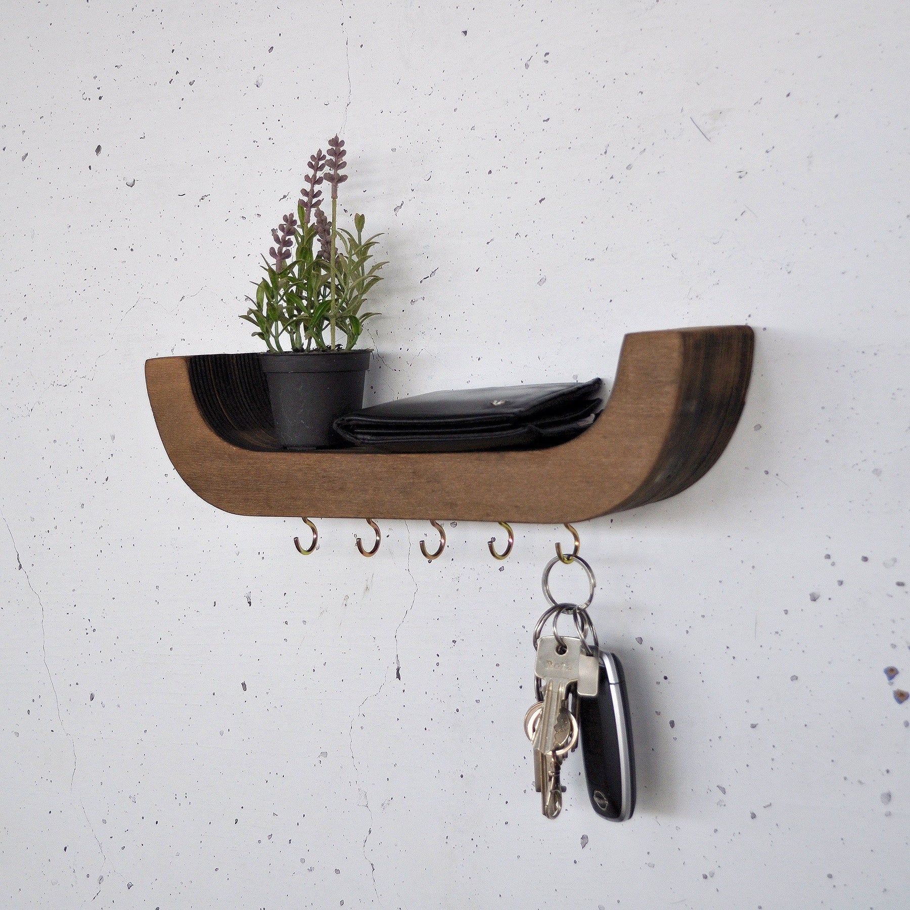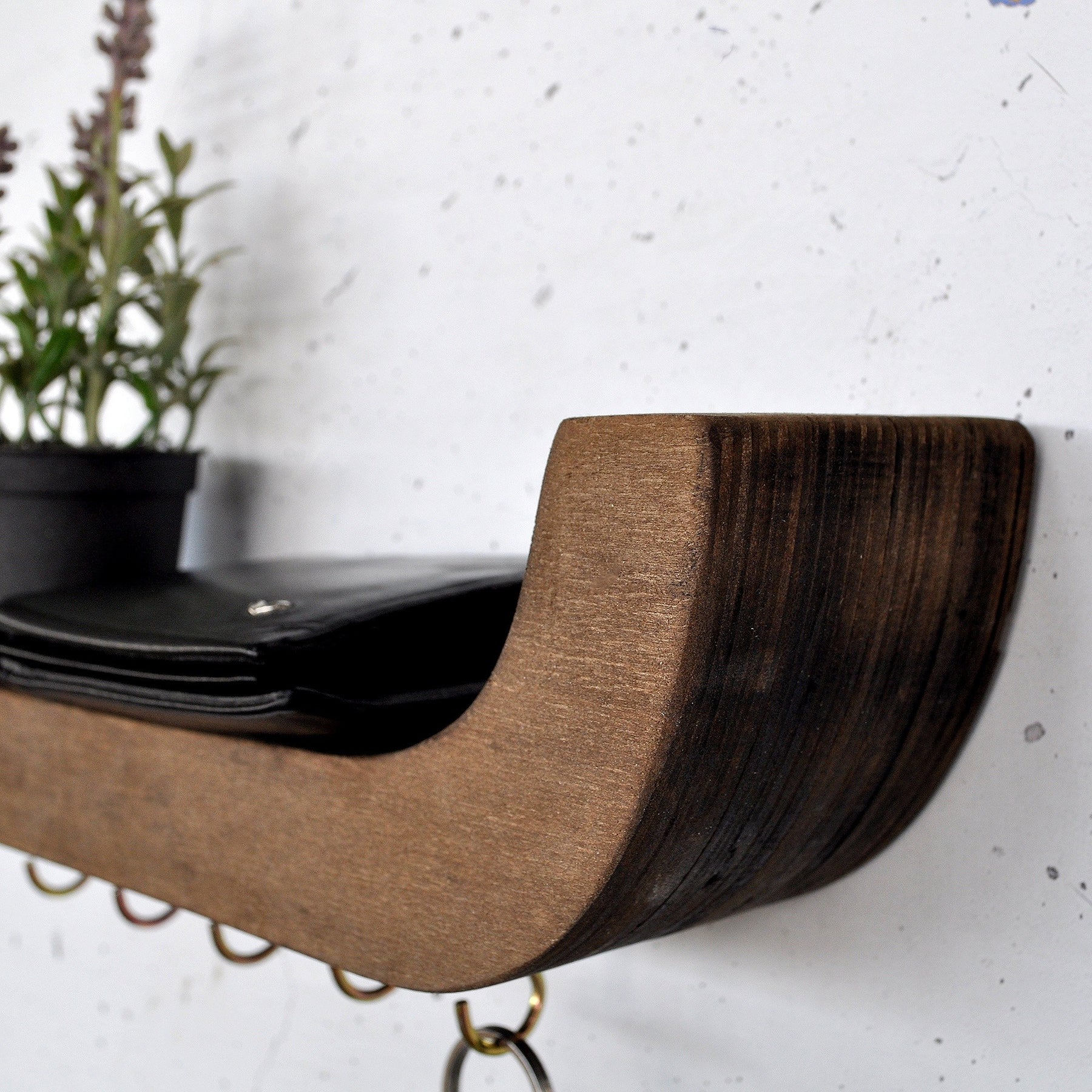 Organizza il tuo ingresso con stile grazie a questa mensola porta chiavi da muro, un complemento d'arredo unico che unisce estetica rustica e massima praticità. Realizzata in legno con finitura naturale scura, questa mensola si distingue per la sua originale forma a barchetta con bordi rialzati, perfetta per accogliere in sicurezza piccoli oggetti quotidiani.