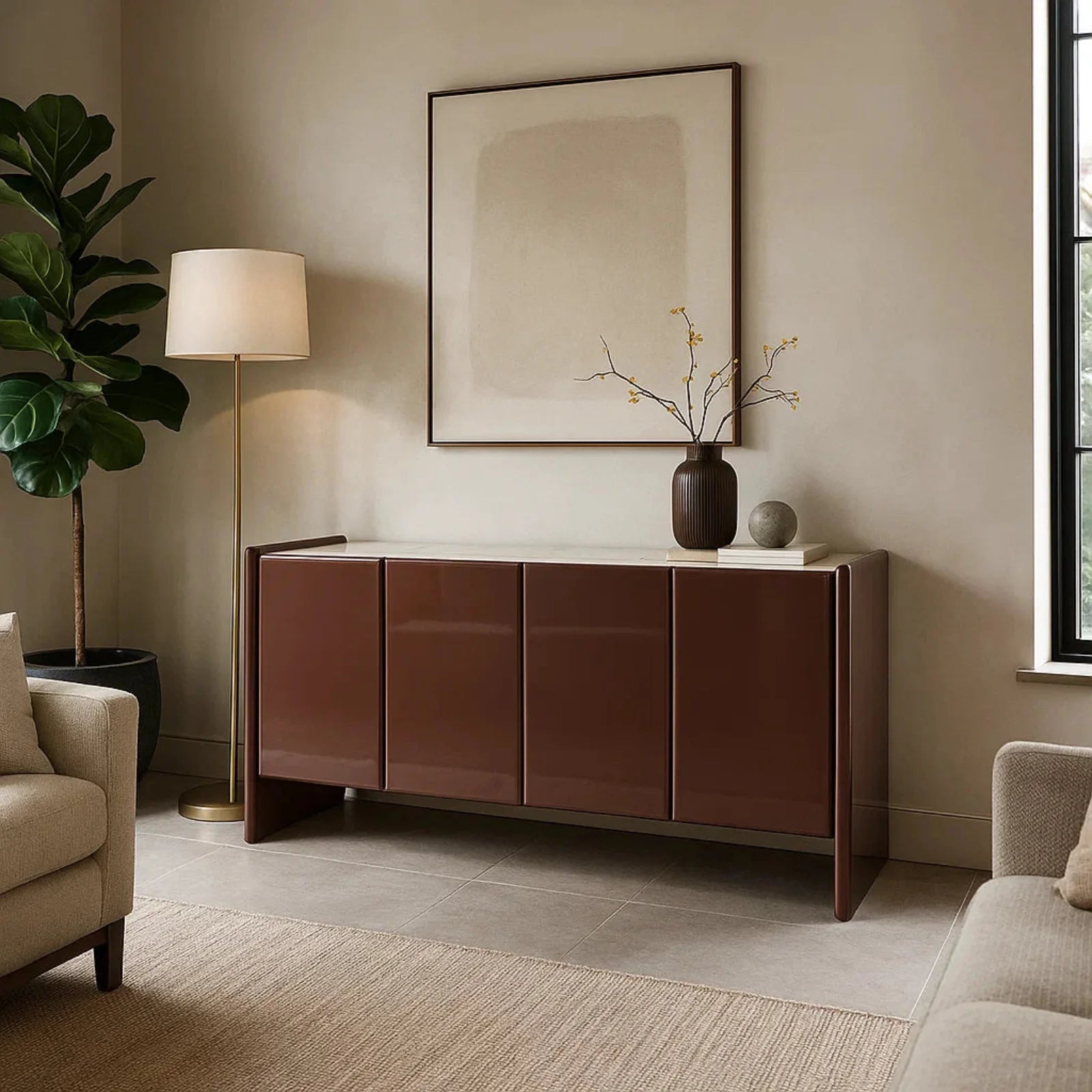 Aggiungi un tocco di eleganza contemporanea e personalità al tuo soggiorno o sala da pranzo con la nostra esclusiva madia a 4 ante nel raffinato colore Bordeaux. Questo mobile di design unisce la praticità di un ampio spazio contenitivo a un'estetica ricercata che non passa inosservata.