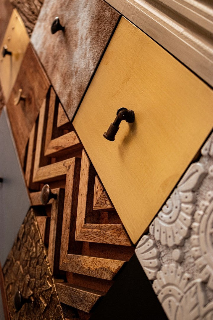 Dai personalità e colore al tuo salotto o soggiorno con questa sorprendente madia cassettiera patchwork. Questo mobile contenitore non è solo funzionale, ma una vera opera d'arte moderna, perfetta per chi ama lo stile Eclettico, Industriale-Vintage o Boho-Chic. La struttura solida in legno di mango fa da base a un fronte audace e variegato, composto da un mosaico di ante e cassetti che utilizzano finiture, texture e materiali diversi.