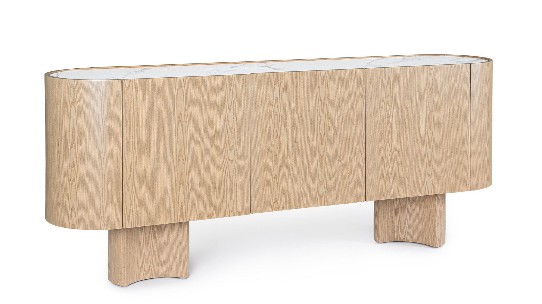 Esibisci un arredo di alta gamma nel tuo soggiorno di design o sala da pranzo con questa straordinaria madia moderna. Questo pezzo è un esempio perfetto di eleganza scultorea, definita dalle sue linee curve e arrotondate che ammorbidiscono l'ambiente e aggiungono un tocco di lusso minimale. La struttura e le basi sono in mdf impiallacciate in quercia finitura chiara – dalle venature calde e luminose – che richiama il sereno e accogliente stile scandinavo.