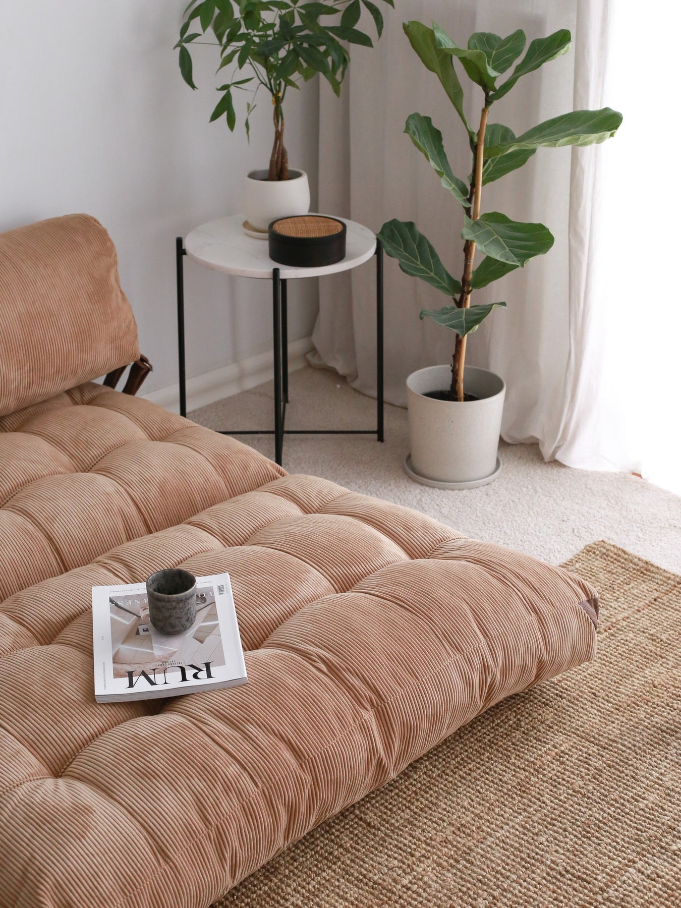 Aggiungi un tocco di stile bohémien e massima funzionalità ai tuoi spazi con questo divano letto matrimoniale in velluto a coste, la soluzione d'arredo perfetta per case giovani, monolocali o zone relax creative. Caratterizzato da una morbida trapuntatura a scacchi e un rivestimento materico di tendenza in tonalità cammello, questo futon da terra offre un comfort eccezionale e una versatilità senza pari, trasformandosi in pochi istanti da accogliente poltrona lounge con schienale a comodo letto per gli ospiti.