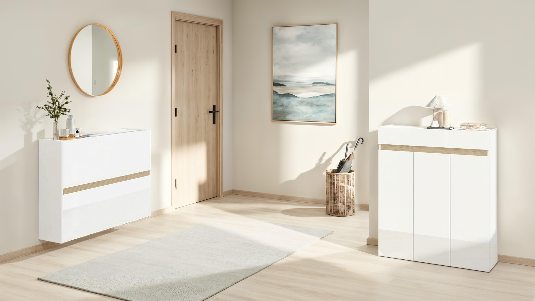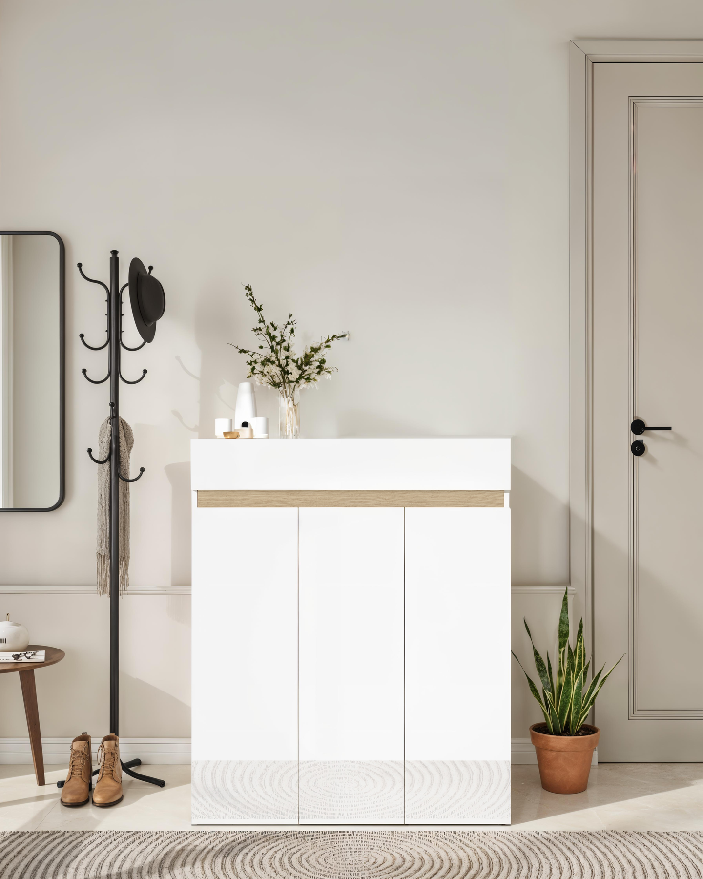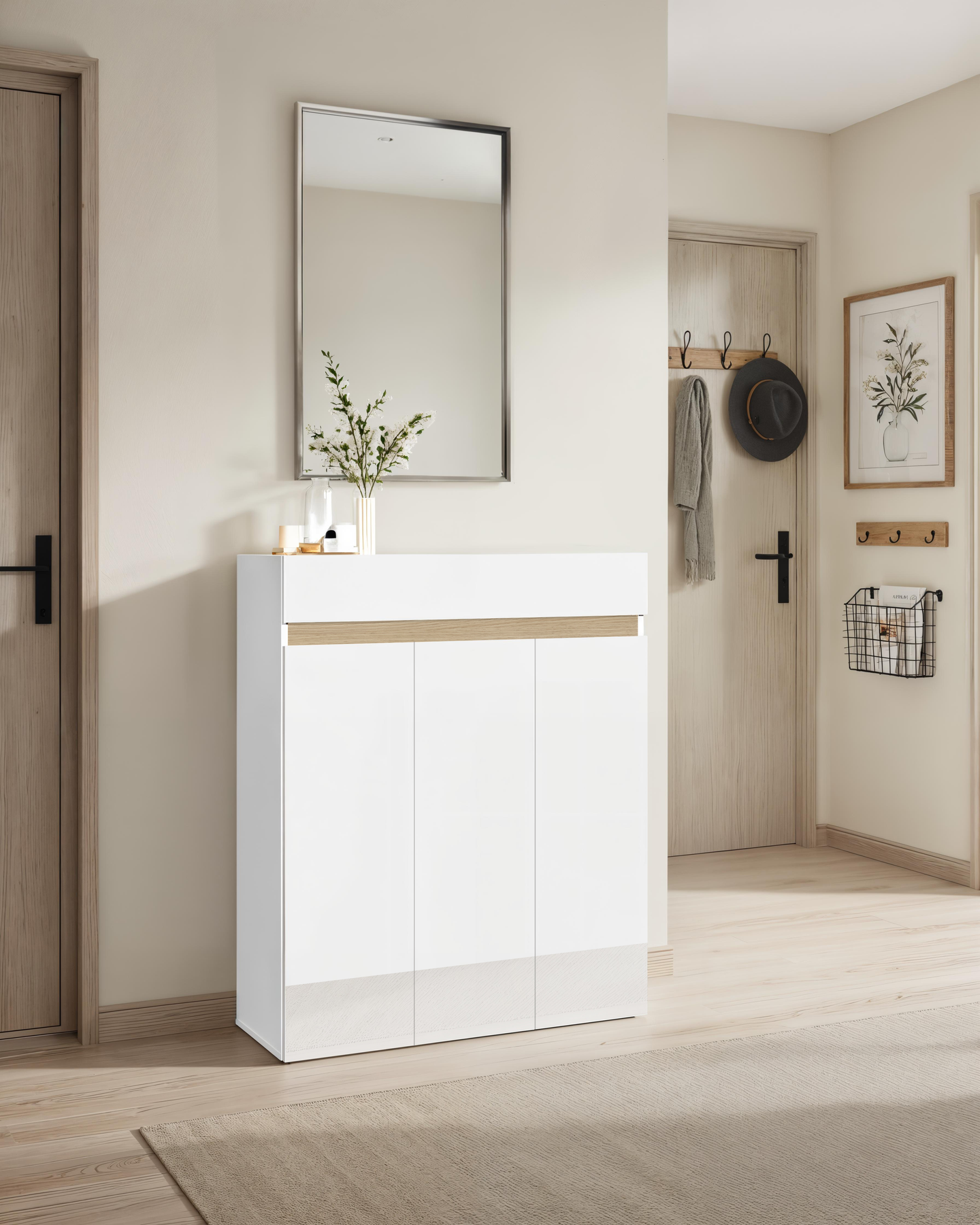 Massimizza l'efficienza dei tuoi spazi senza rinunciare all'eleganza con questa scarpiera moderna a 3 ante, una soluzione d'arredo versatile e luminosa pensata per chi necessita di una grande capacità contenitiva in un design compatto. La struttura esterna si presenta con una finitura bianco lucido di alta qualità, capace di riflettere la luce naturale e donare un senso di ampiezza immediato anche agli ingressi o ai corridoi più stretti. Il rigore minimale del bianco è interrotto da un raffinato inserto orizzontale in legno rovere, che aggiunge un dettaglio materico naturale e accogliente, perfetto per integrarsi in ambienti dal gusto contemporaneo o scandinavo.