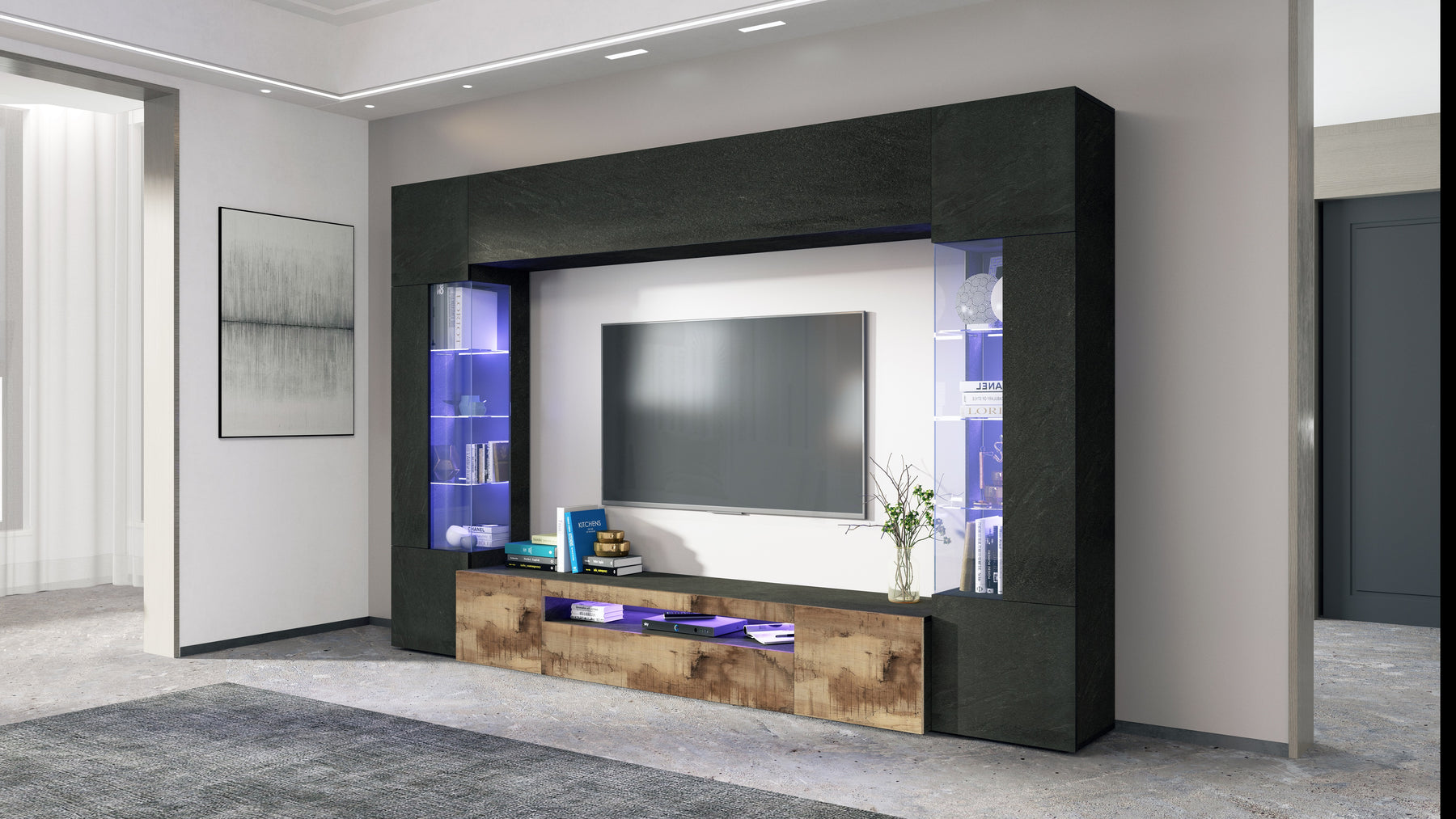 Il contrasto è magistralmente gestito dalla base a terra. Qui, ampi vani contenitori orizzontali sono rivestiti in una finitura pero con un marcato effetto legno rustico/vissuto, che bilancia il rigore della cornice scura e aggiunge una nota di calore. L'integrazione di una discreta illuminazione a LED nella base centrale accentua questo contrasto.